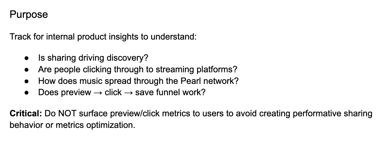 This philosophy has directly shaped Pearl Music. My co-founder, Kayla, & I had a lot of discussions while designing some foundational aspects of Pearl. One being how we think about engagement & interactions within the app. How do we help people unlearn some of the other habits that have come from other social platforms?